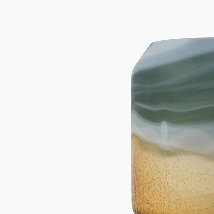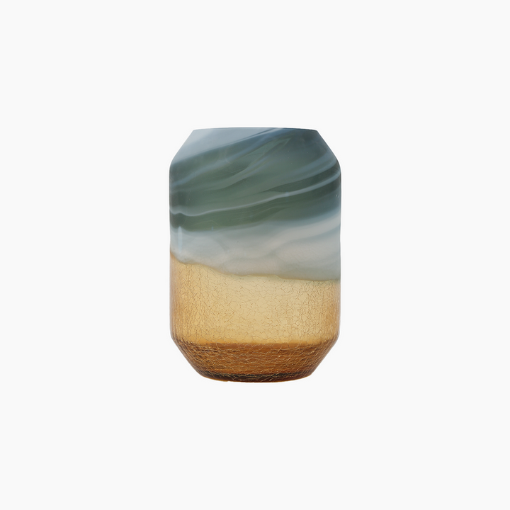 The Two-Color Vase M stands out in any setting with its modern design and striking color transitions. The soft transitions of green and blue tones at the top combine with the golden texture at the bottom to create an elegant aesthetic. This vase will be an indispensable piece for minimalist and stylish decorations.