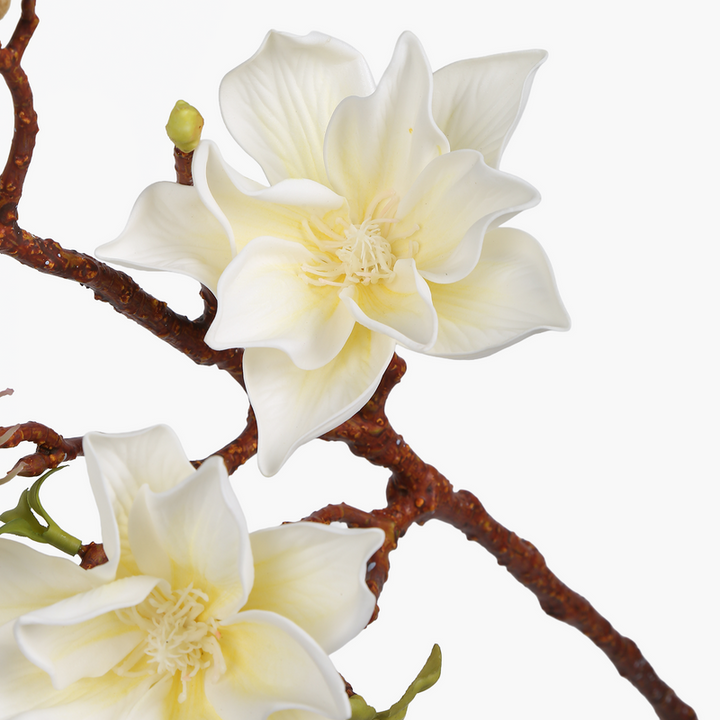 This 80 cm long Magnolia Branch in Yellow and White creates a sophisticated atmosphere in your home or workplace with its natural branches and elegant flowers. Combining handcrafted artistry and elegance, this design complements both classic and modern decor, adding sophistication to your spaces. Durable and easy to care for, this flower branch is inspired by nature.