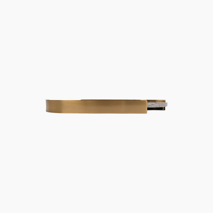 This oval tray, measuring 54x25x5 cm and made of marble and metal, offers a modern and elegant look. With its grey marble surface and gold-colored metal frame, it provides both durability and aesthetic appeal. It offers a wide range of uses, from serving food to decorative purposes.