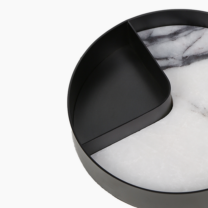 With its modern design and elegant texture, this round marble and stainless steel tray adds an aesthetic touch to your table settings. Featuring the natural veins of white marble and a matte black stainless steel frame, it can be used as both a functional and decorative piece. It offers both style and quality for serving snacks, desserts, or coffee.