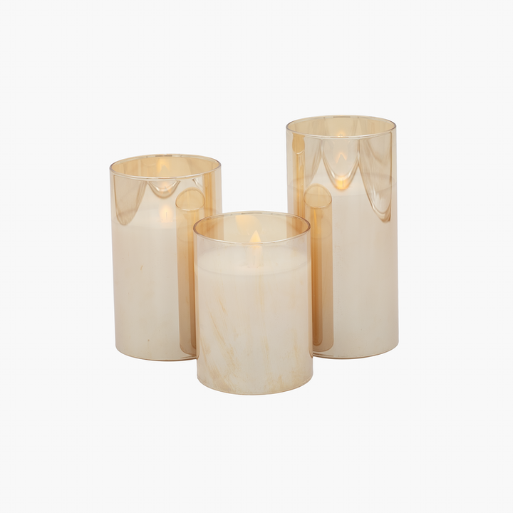 Amber tonlarının sıcak ve davetkar ışığıyla tasarlanmış bu 3’lü LED mum seti, evinizde romantik ve huzurlu bir atmosfer yaratır. Zarif cam yüzeyleri ve çizgili deseni sayesinde dekorasyona modern bir şıklık katar. Uzaktan kumandasıyla kolayca kontrol edilebilen bu set, ister günlük kullanımda ister özel davetlerde ortama büyüleyici bir hava ekler.