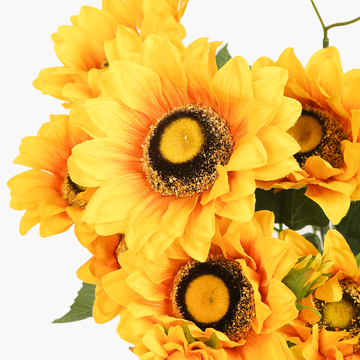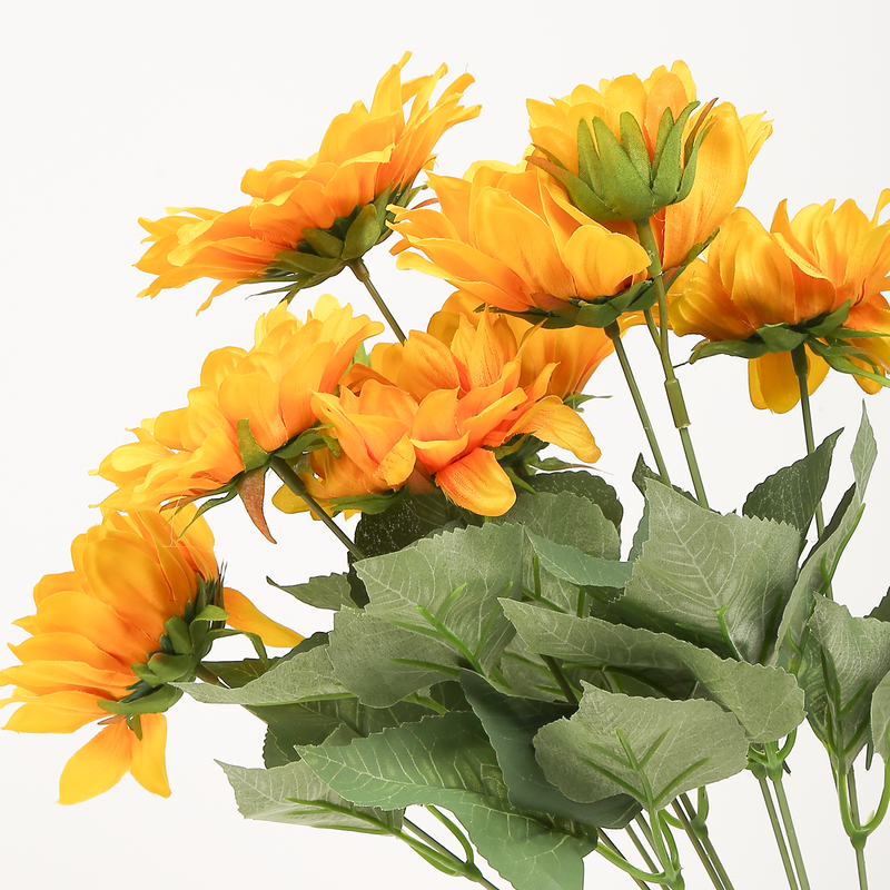 48 cm boyundaki çok başlı ayçiçeği dalı, güneşin enerjisini ve neşesini mekanlarınıza taşıyor. Canlı sarı yaprakları ve gerçekçi yapısıyla ev dekorasyonundan etkinlik süslemelerine kadar geniş bir kullanım alanı sunar. Vazo düzenlemelerinde veya tek başına dekoratif bir vurgu olarak kullanılabilir.