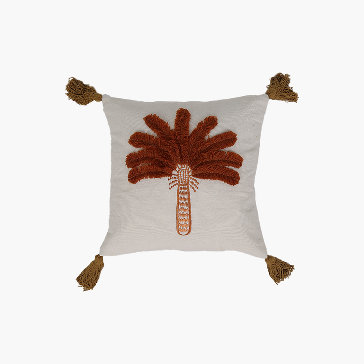 Beyaz Keten Palmiye Nakışlı Kare Kırlent
