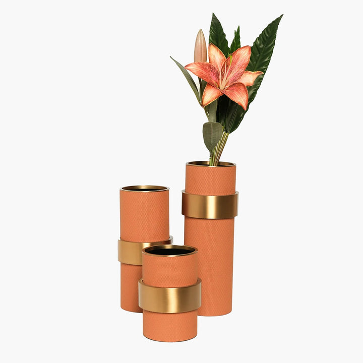 Büyük deri vazo (Ø13x34 cm), etkileyici yüksekliğiyle her mekâna şıklık katacak göz alıcı bir dekoratif parçadır. Bu yükseklik, daha büyük çiçek düzenlemeleri için idealdir, ve kahverengi deri ile altın renkli halka, vazoya lüks bir dokunuş kazandırır. Yaşam alanınıza yapı ve stil getirmek için mükemmel bir tercihtir.