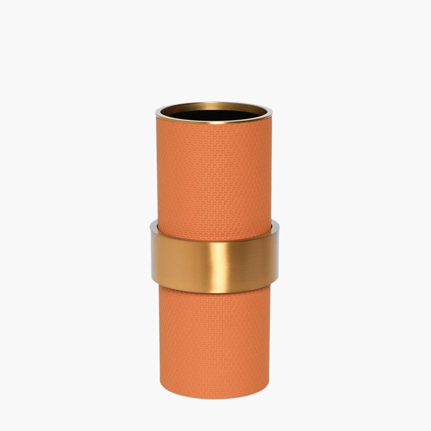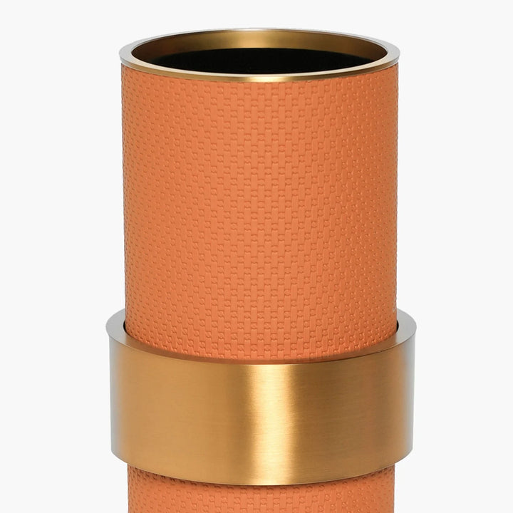 Orta boy deri vazo (Ø11,5x27 cm), boyut ve tasarım arasında mükemmel bir denge sunar. Zarif ve ince yapısı ile her türlü yaşam alanına kolayca uyum sağlar. Kahverengi deri ve altın renkli halka, bu vazoya modern ve şık bir dokunuş katar, hem modern hem de klasik dekorlara mükemmel uyum sağlar.