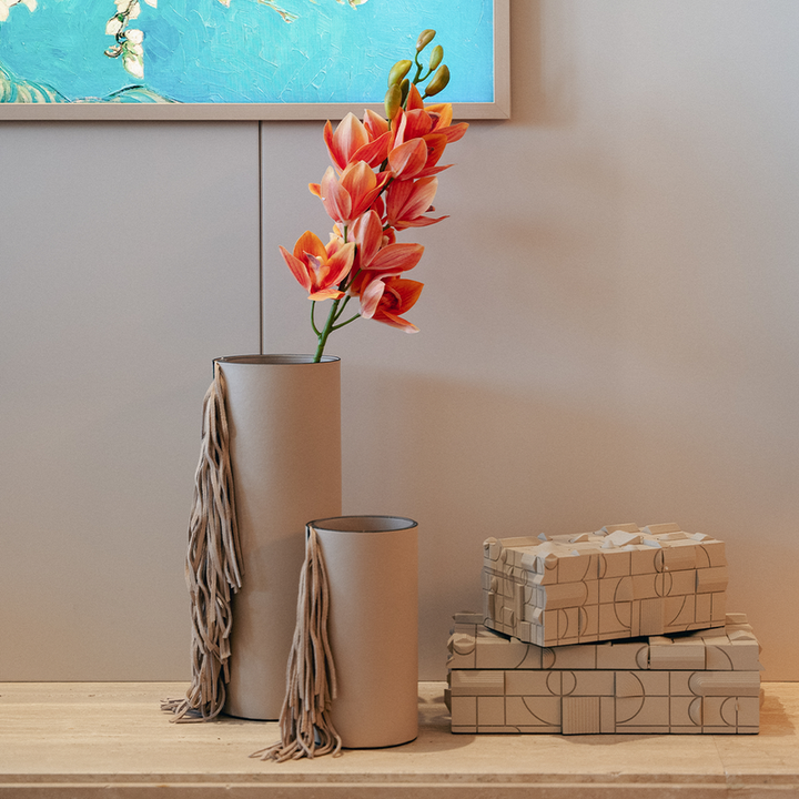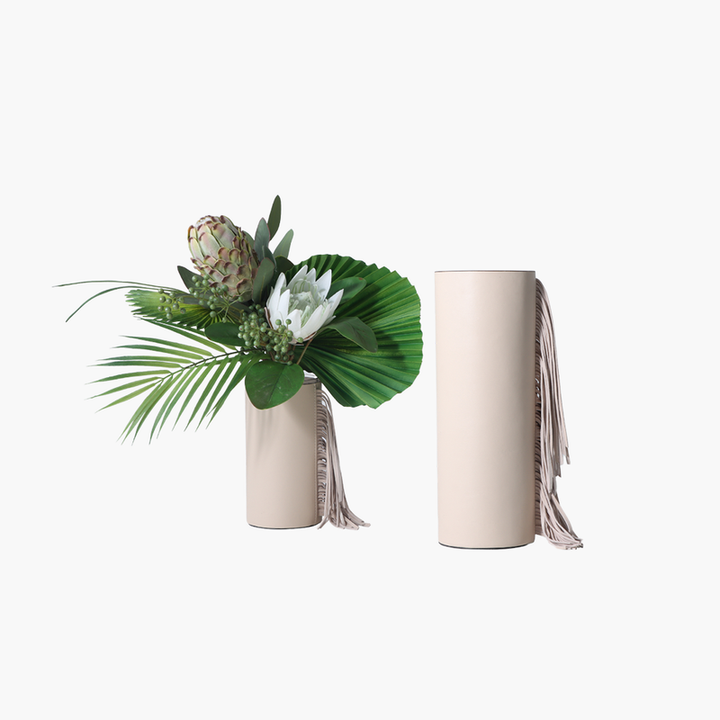İpucu: Bu uzun deri vazoyu yüksek tavanlı mekanlarda veya geniş alanlarda çiçek aranjmanları ile kullanarak dikkat çekici bir estetik yaratabilirsiniz. Jasmin Concepts'in minimalist koleksiyonuyla uyumlu bir dekorasyon için diğer sütbeyaz deri ürünlerle kombinleyebilirsiniz.