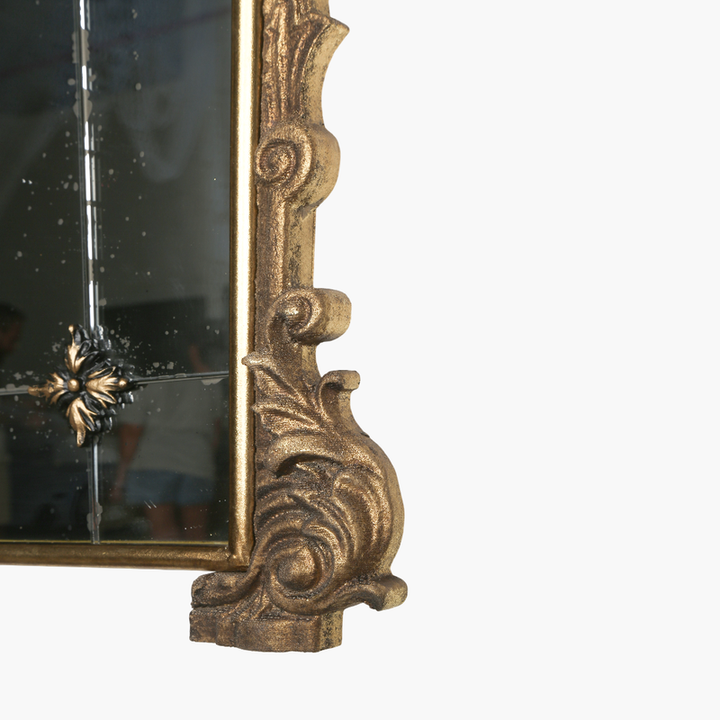 Altın detaylarla süslenmiş bu zarif duvar aynası, yaşam alanlarınıza sofistike bir hava katıyor. Antik görünümle modern işçiliği bir araya getiren bu ayna, odanızın dekorasyonunu tamamlayan şık bir parça olarak öne çıkıyor. İster oturma odanızda, ister giriş holünüzde, bu eşsiz tasarım ışığı yansıtarak mekana derinlik ve ferahlık sağlar.
