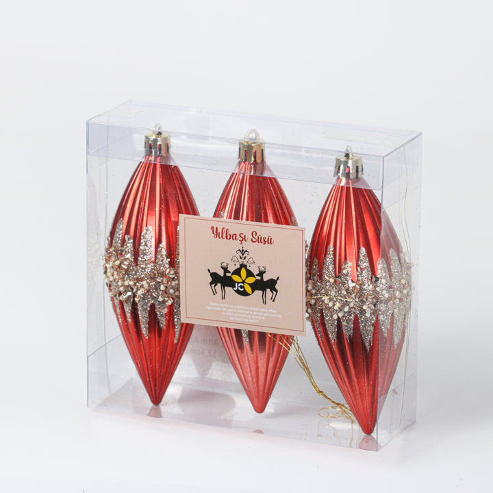 Işıltılı detayları ve zarif formuyla JC Altın Ağaç Süsü Seti, yılbaşı ağacınızı göz kamaştırıcı bir şıklıkla tamamlar. Kırmızı zemin üzerine işlenen altın sim ve taş süslemeler, ağacınıza hem klasik hem de modern bir hava katar. Her biri özenle tasarlanmış 3 parçalık set, farklı kombinasyonlarla dekorasyonunuzu zenginleştirir.