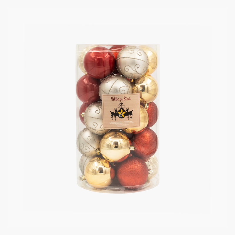 Zarif ve modern dekorasyonun vazgeçilmez parçalarından olan JC altın-beyaz simli premium ağaç süsü seti, şıklığı ve sadeliği bir araya getiriyor. Altının göz alıcı parlaklığı ile beyazın saf ışıltısını buluşturan bu 24 parçalık set, yılbaşı ağacınıza asil bir görünüm kazandırır. 8 cm boyutundaki süsler, farklı yüzey dokuları ve simli detaylarıyla hem evlerde hem de mekanlarda sofistike bir atmosfer yaratır.