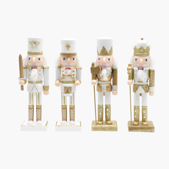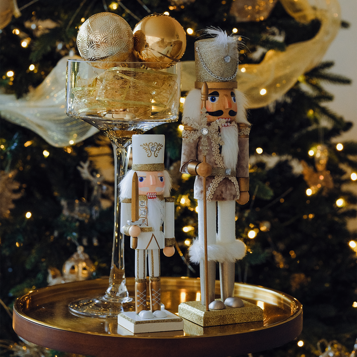 Zarif beyaz ve altın detaylarla süslenmiş JC Beyaz & Altın Kılıçlı Nutcracker, yılbaşı dekorasyonlarına klasik ve asil bir dokunuş katar. El işçiliğiyle boyanmış figür, altın kılıcıyla güçlü bir duruş sergilerken, stantlı tasarımı sayesinde masa, raf veya vitrin üzerinde sabit ve şık bir şekilde sergilenebilir. Geleneksel nutcracker figürünü modern renklerle buluşturan bu dekoratif obje, hem ev hem de ofis süslemelerinde öne çıkar.