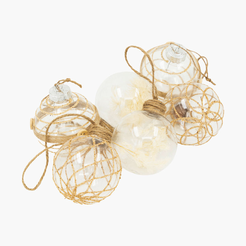 JC Bohem Koleksiyonu’nun en doğal parçalarından biri olan şeffaf ağaç süsü seti, rustik detayları ve zarif görünümüyle yılbaşı dekorunuza sade bir şıklık katıyor. Doğal iplerle sarılı cam görünümlü toplar ve içi minik dekorlarla süslenmiş şeffaf tasarımlar, bohem tarzın sıcaklığını yansıtır. Minimalist çizgileriyle hem modern hem de doğal bir atmosfer yaratır.
