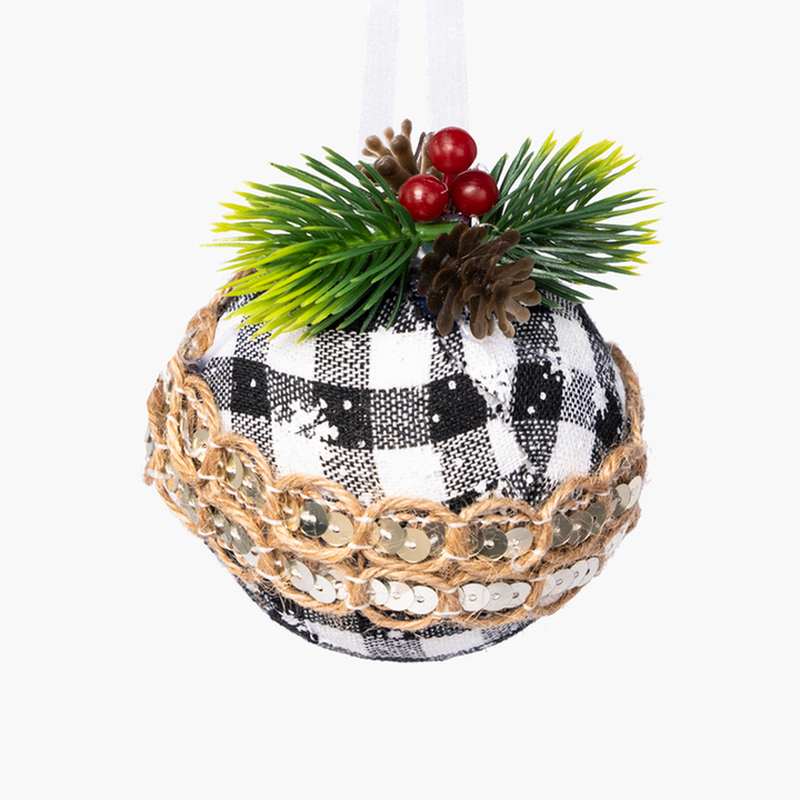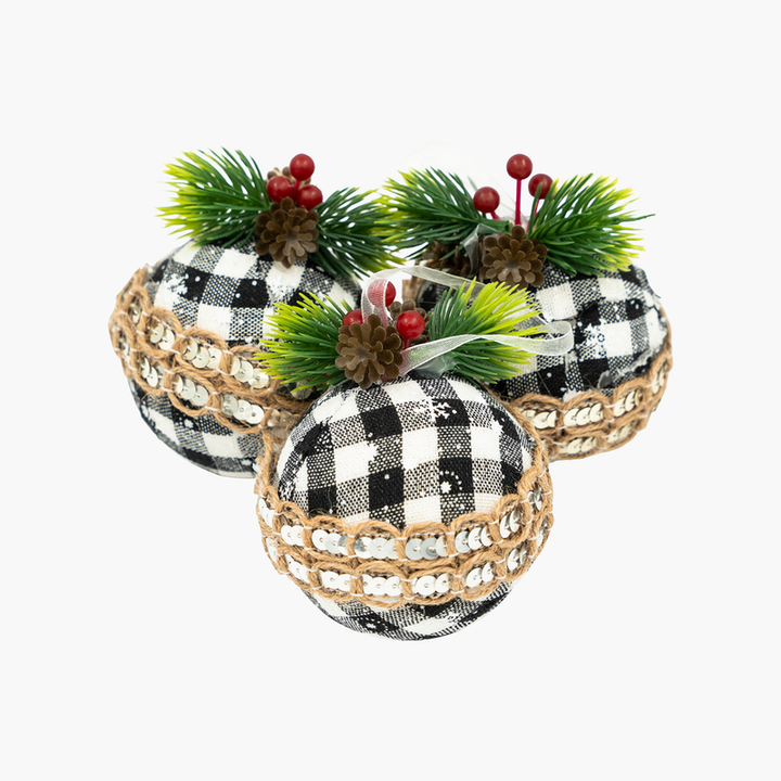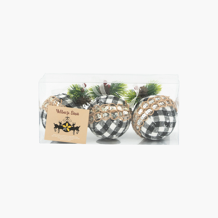 Modern çizgileriyle dikkat çeken JC Bohem siyah-beyaz yuvarlak ağaç süsü seti, yılbaşı ağacınıza şık ve farklı bir hava katar. 8 cm boyutundaki süsler, kare desenli kumaş kaplamasıyla bohem tarzı yansıtırken, doğal jüt ipi ve payet detaylarıyla zarif bir ışıltı sunar. Üst kısımdaki çam yaprakları, kırmızı meyve ve minik kozalak süslemeleriyle kışın doğallığını yaşam alanlarınıza taşır.