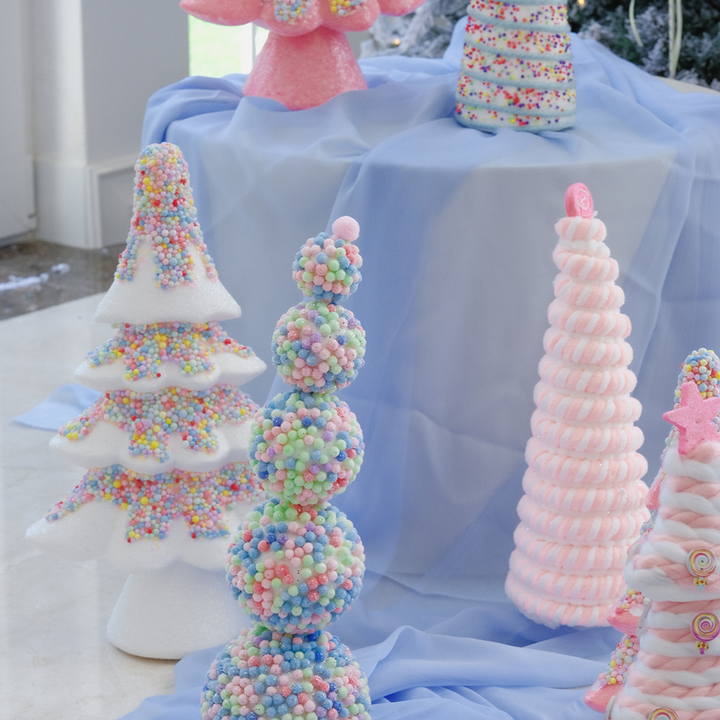 JC Happy Sugar koleksiyonundaki pembe şeker ağaç dekor, hediye kutuları ve candy stick süslerle birlikte kullanıldığında eğlenceli bir bütünlük sağlar. Özellikle yılbaşı ağacının yanında ya da giriş alanlarında sergilendiğinde dikkat çekici bir atmosfer yaratır.