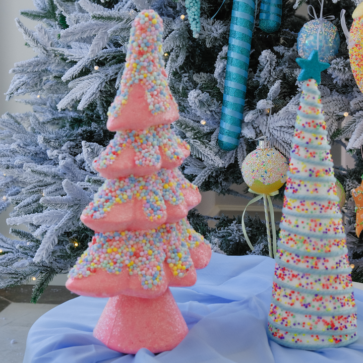 JC Happy Sugar koleksiyonundaki şeker ağaç dekorları, hediye kutuları ve donut süslerle kombinlenerek bütünlük sağlanabilir. Farklı boyutlardaki konik dekorlarla bir arada kullanıldığında etkileyici bir masa veya vitrin dekorasyonu ortaya çıkar.