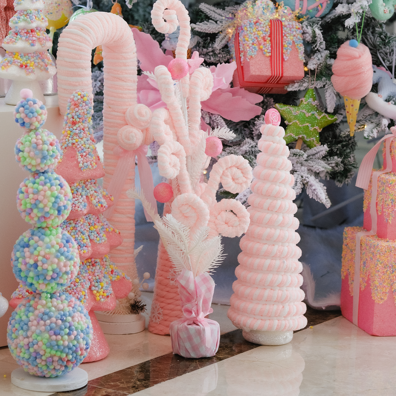 JC HAPPY SUGAR koleksiyonundaki baston şeker dekorları, rainbow şeker topları ve pembe ağaç süsleriyle bir araya getirilerek uyumlu bir konsept oluşturur. Ayrıca JC koleksiyonundaki diğer pastel konik dekorlarla kombinlendiğinde daha etkileyici ve bütünsel bir masa ya da vitrin düzenlemesi yapılabilir.
