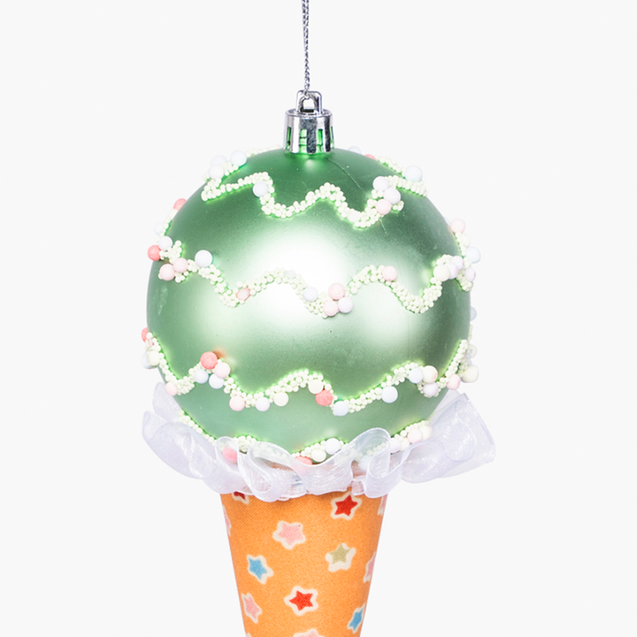 JC Happy Sugar koleksiyonunun en eğlenceli parçalarından biri olan yeşil icecream süs, tatlı bir dondurma görünümüyle yılbaşı dekorunuza neşe katıyor. Üzeri renkli boncuk detaylarıyla süslenmiş parlak yeşil küre, yıldız desenli külah tasarımıyla tamamlanıyor. Dayanıklı yapısıyla uzun yıllar keyifle kullanılabilecek bu özel süs, çocuklu aileler ve pastel tonları sevenler için mükemmel bir tercih.