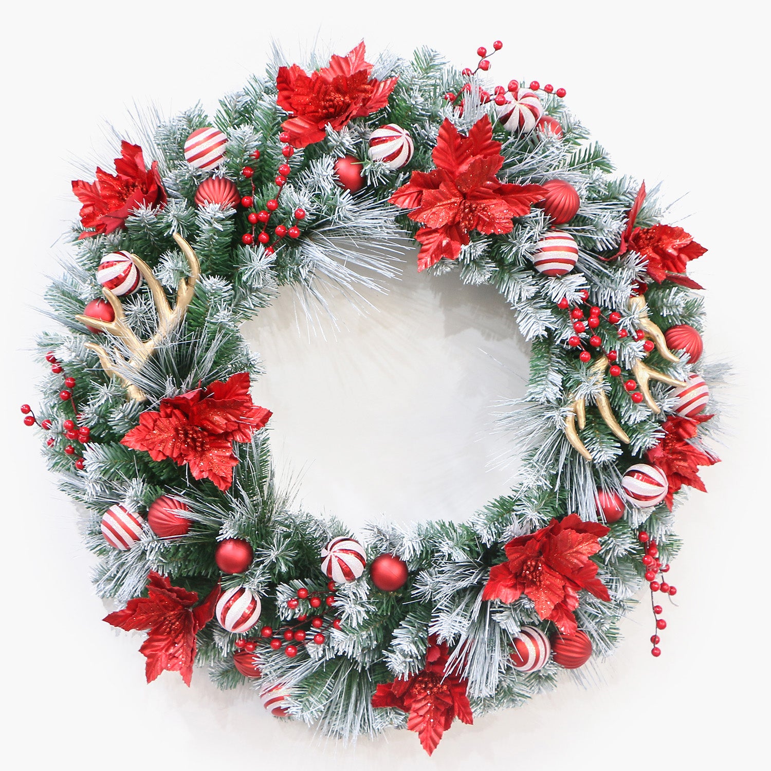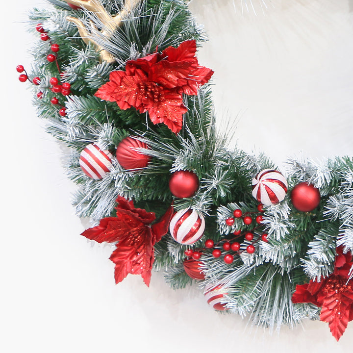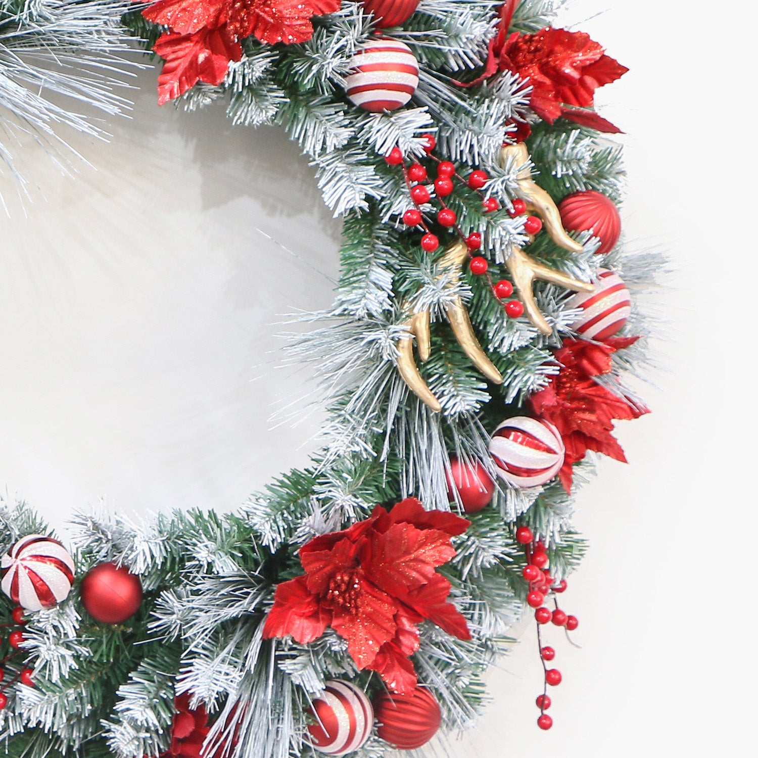 JC Kendinden Kırmızı Süslü Karlı Çelenk 80cm XL (Kendinden Led'li)