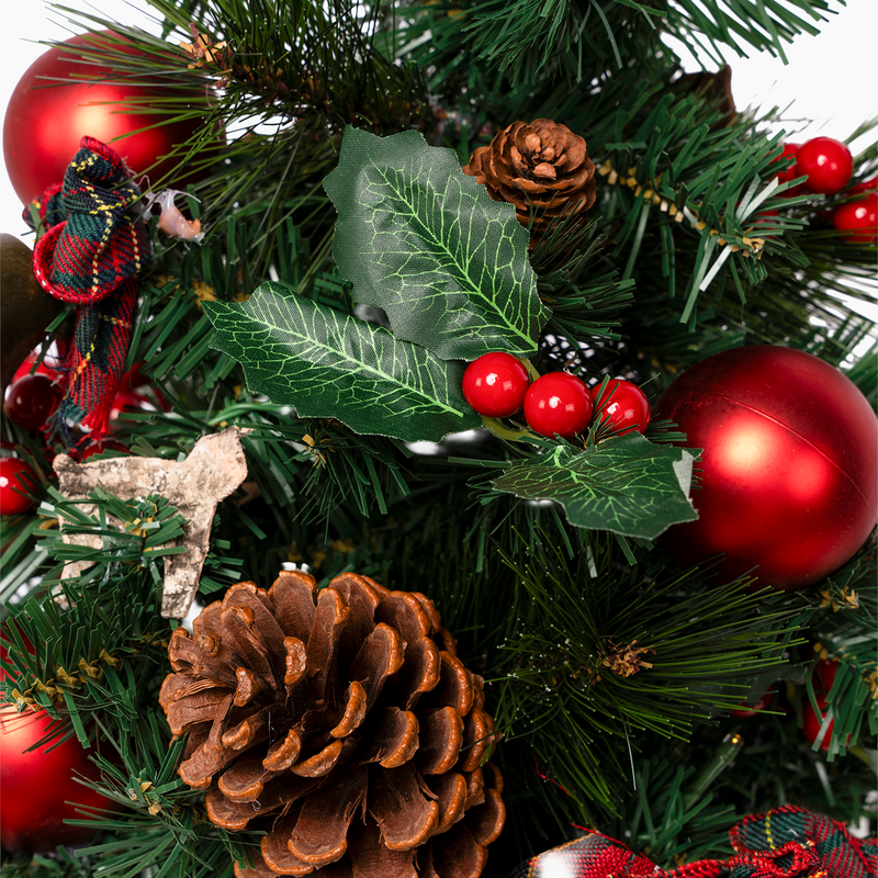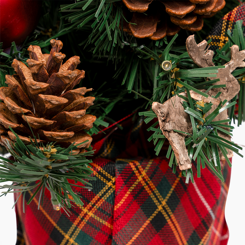 Renk: Yeşil dallar, kırmızı toplar ve desenli kumaş kaplı saksı
