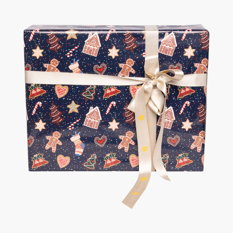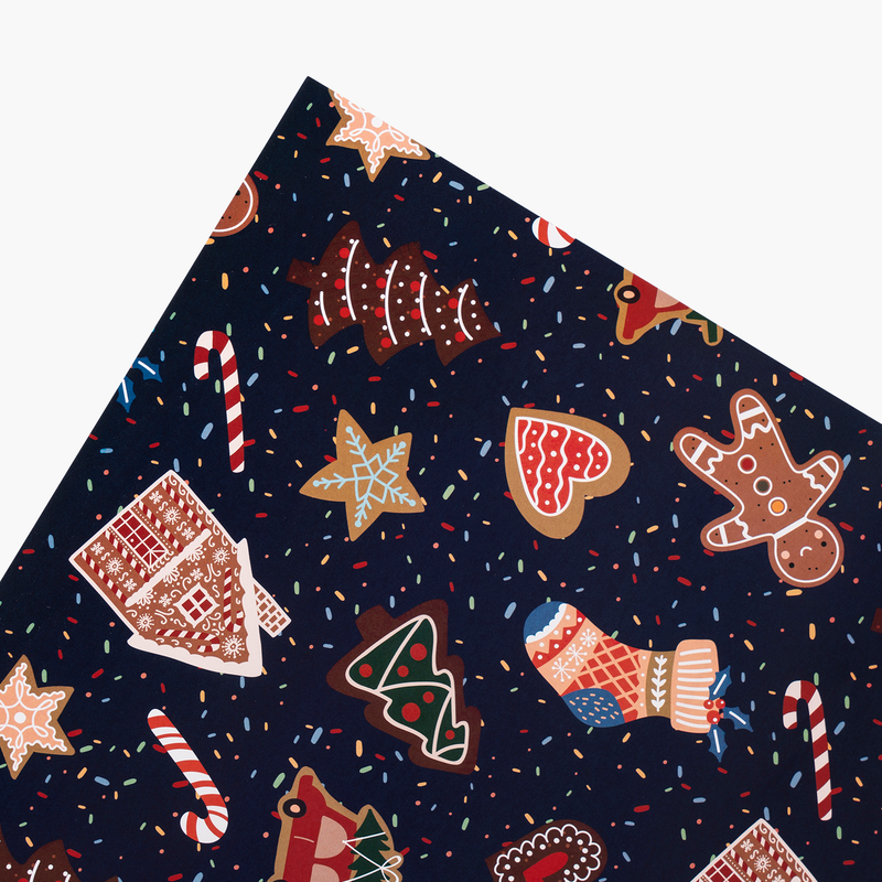 Renk: Lacivert zemin üzerine renkli yılbaşı kurabiye desenleri