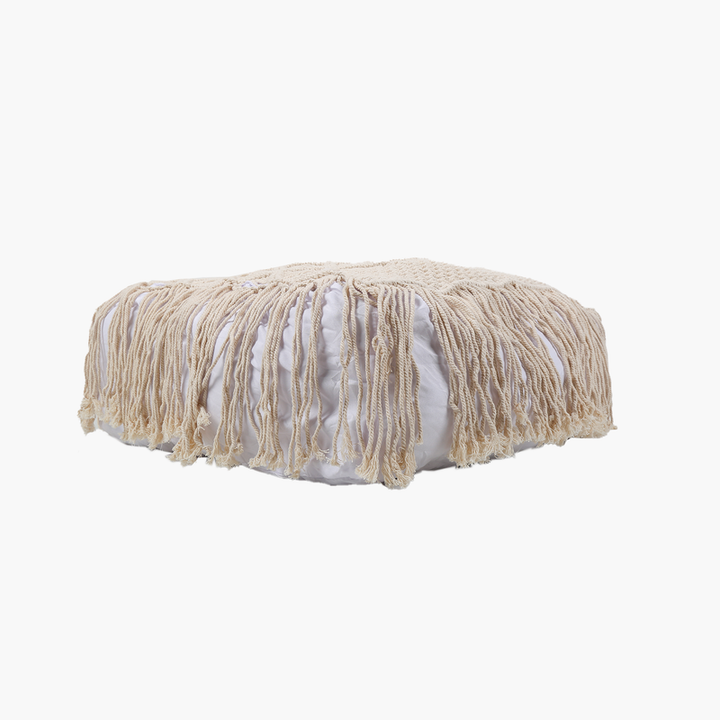 İpucu: Bu pufu, makrome detaylı yastıklar veya halılarla kombinleyerek dekorasyonunuza uyumlu bir bütünlük kazandırabilirsiniz. Rustik mobilyalarla bir araya getirilerek sıcak ve doğal bir görünüm elde edebilirsiniz.