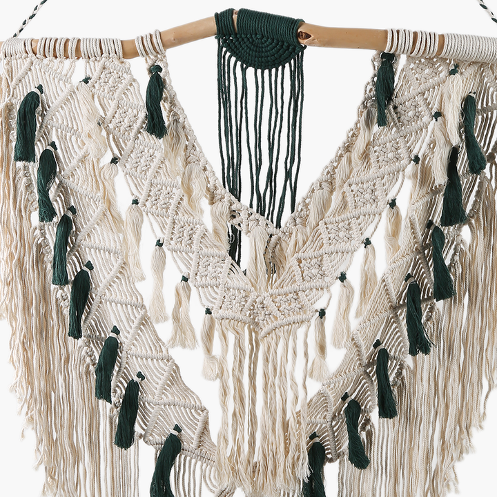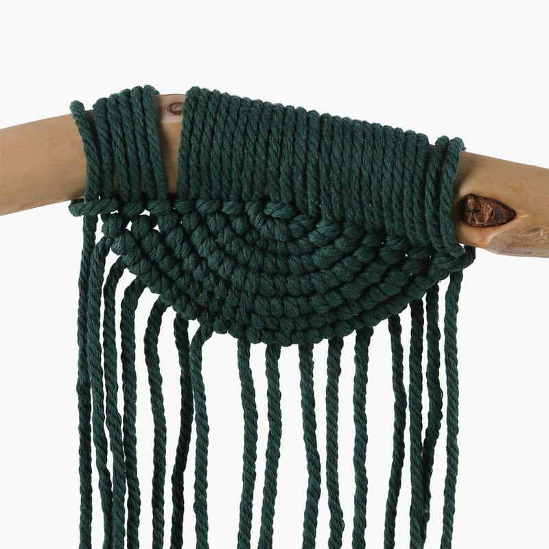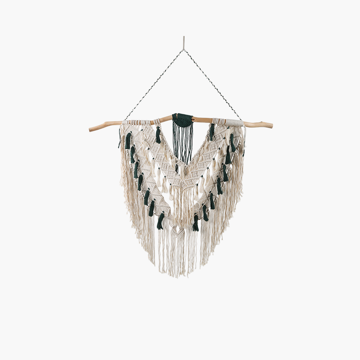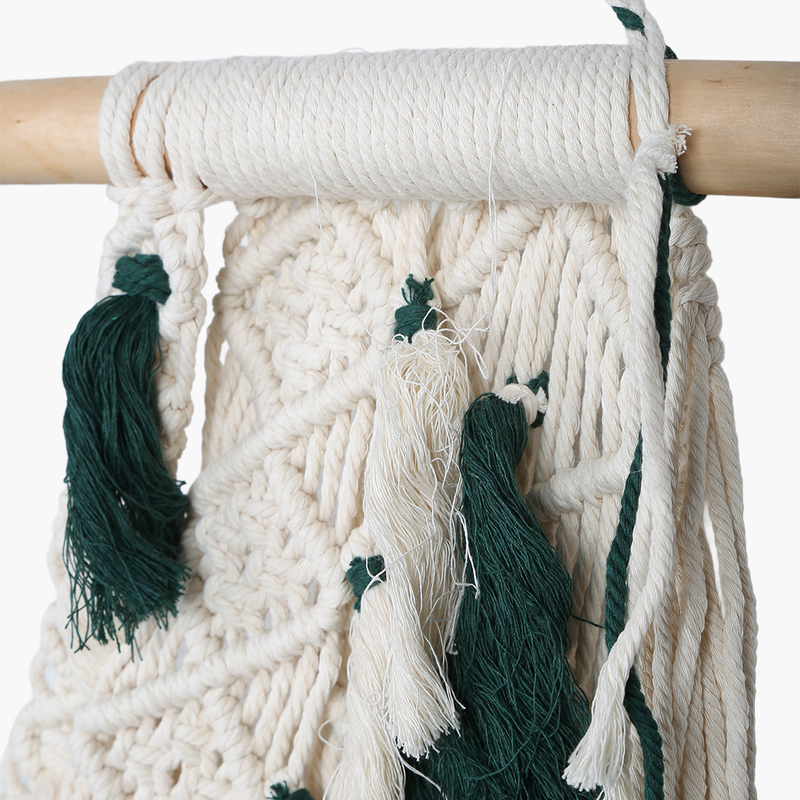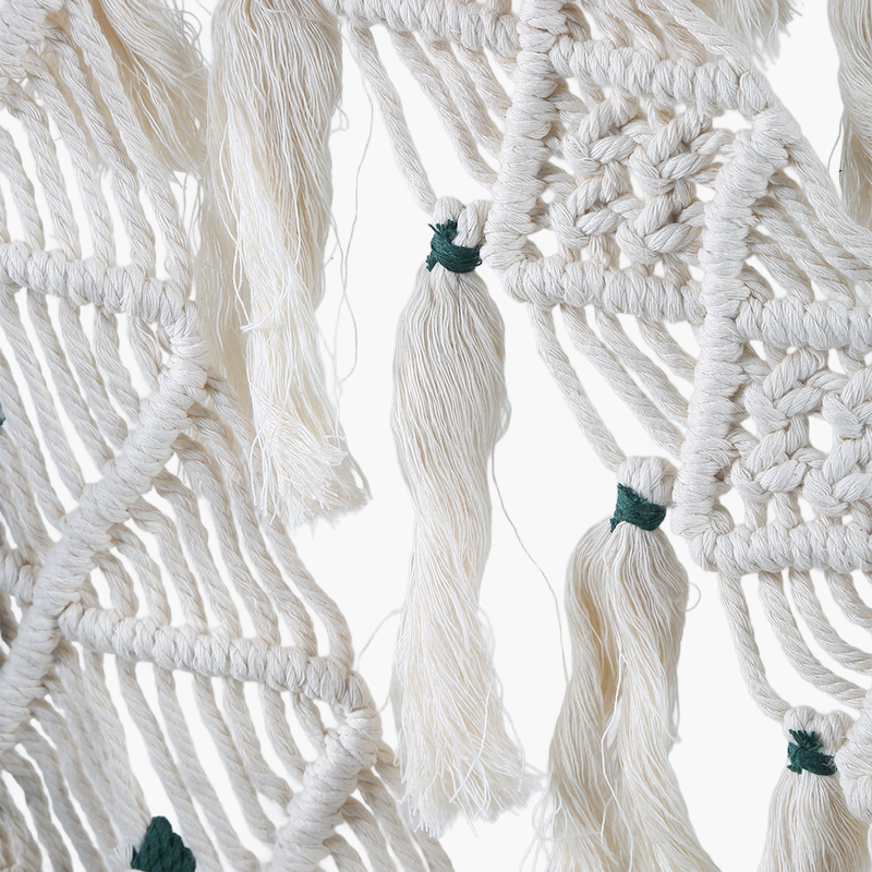 Doğallık ve modern tasarımın birleşimi olan 120x120 cm boyutlarındaki bu makrome duvar dekoru, geniş alanlar için özel olarak tasarlanmıştır. El işçiliğiyle hazırlanmış bu eşsiz tasarım, krem, yeşil ve doğal tonlardaki püskülleri ve ahşap detaylarıyla dikkat çeker. Çarpıcı tasarımı ve büyük boyutlarıyla mekanlarınıza sofistike bir hava katar.