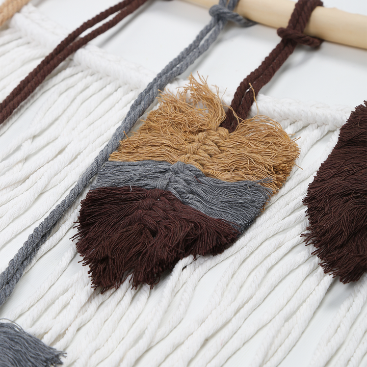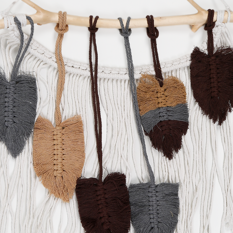 Doğanın renk paletinden ilham alan bu 50x55 cm boyutlarındaki makrome duvar dekoru, yaşam alanlarınızı sıcak ve şık bir şekilde dekore etmenize olanak tanır. Beyaz, kahverengi, gri ve açık kahve tonlarıyla kombine edilen el yapımı düğümler, eşsiz bir estetik sunar. Ahşap çubuk detayı, ürünün doğal tasarımını tamamlar ve her türlü dekorasyon stiline uyum sağlar.