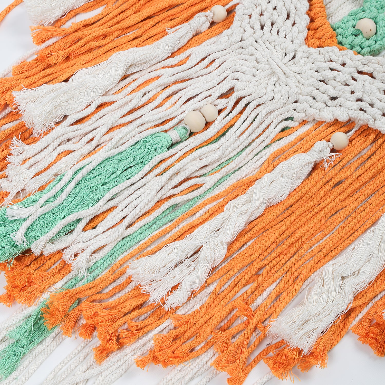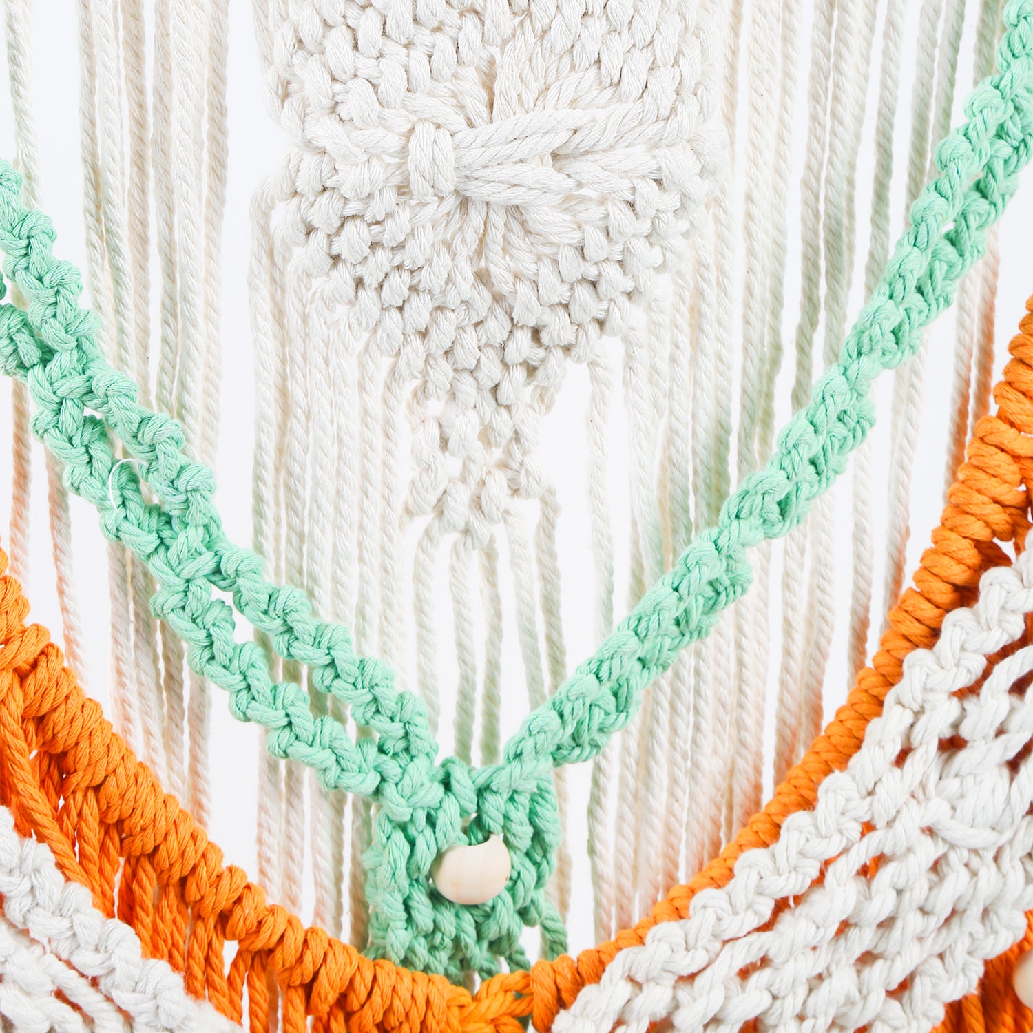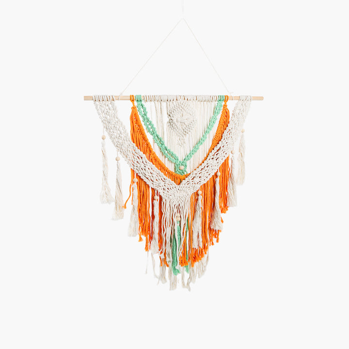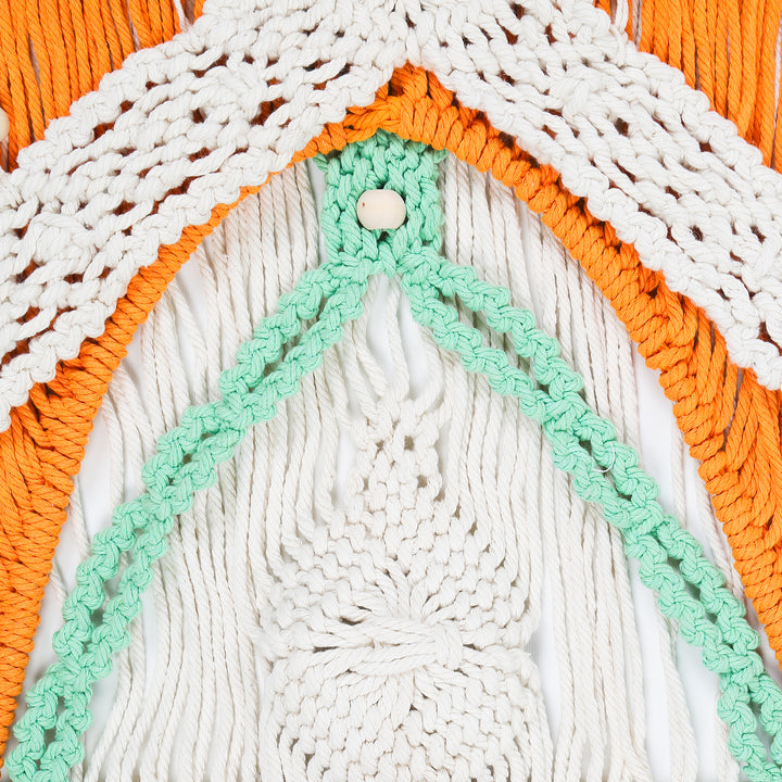 Canlı renklerin ve doğal malzemelerin bir araya geldiği 65x80 cm boyutlarındaki bu makrome duvar dekoru, yaşam alanlarınıza enerjik ve modern bir hava katar. El işçiliğiyle özenle hazırlanmış bu tasarım, turuncu, yeşil, beyaz ve krem tonlarıyla dikkat çeker. Ahşap detayları ve yumuşak dokusuyla sıcak bir atmosfer yaratır.