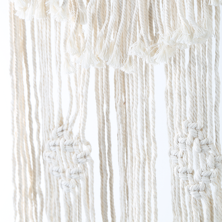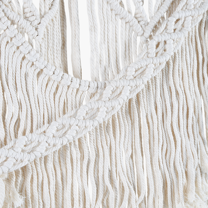Evinize zarif ve etkileyici bir atmosfer katmak için özel olarak tasarlanan 180x170 cm boyutlarındaki bu büyük makrome duvar dekoru, şık krem rengi ve detaylı düğüm tasarımıyla dikkat çeker. El işçiliğinin en güzel örneklerinden biri olan bu parça, hem modern hem de bohem tarzlara mükemmel uyum sağlar.