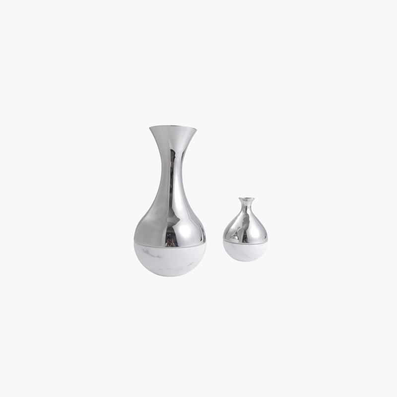 11 cm çapında ve 15 cm yüksekliğindeki bu kompakt paslanmaz çelik ve mermer vazo, küçük ama etkileyici bir dekoratif obje arayanlar için mükemmel bir seçenektir. Parlak çelik yüzeyiyle dikkat çeken tasarım, doğal mermer tabanıyla sofistike bir görünüm sunar. Minimalist estetiği sayesinde hem modern hem de klasik iç mekanlarda zarif bir tamamlayıcı olur.