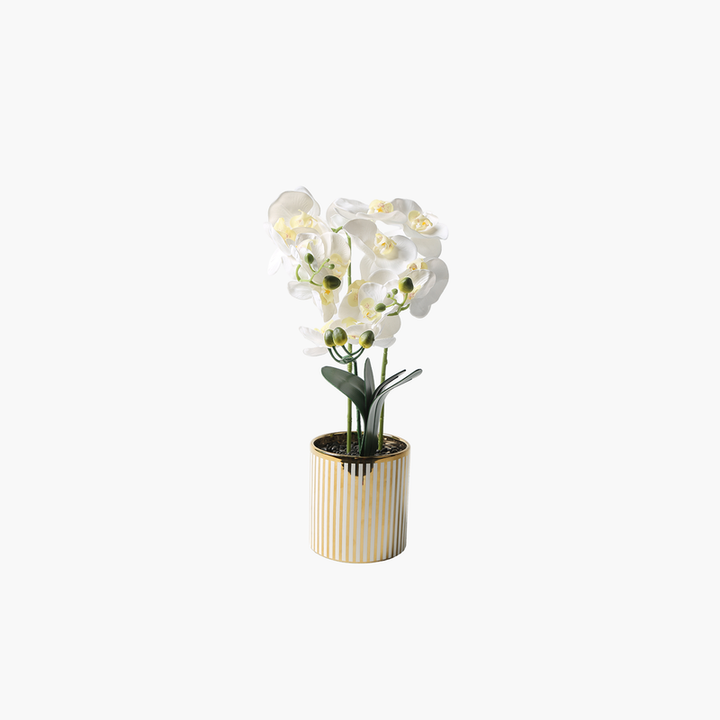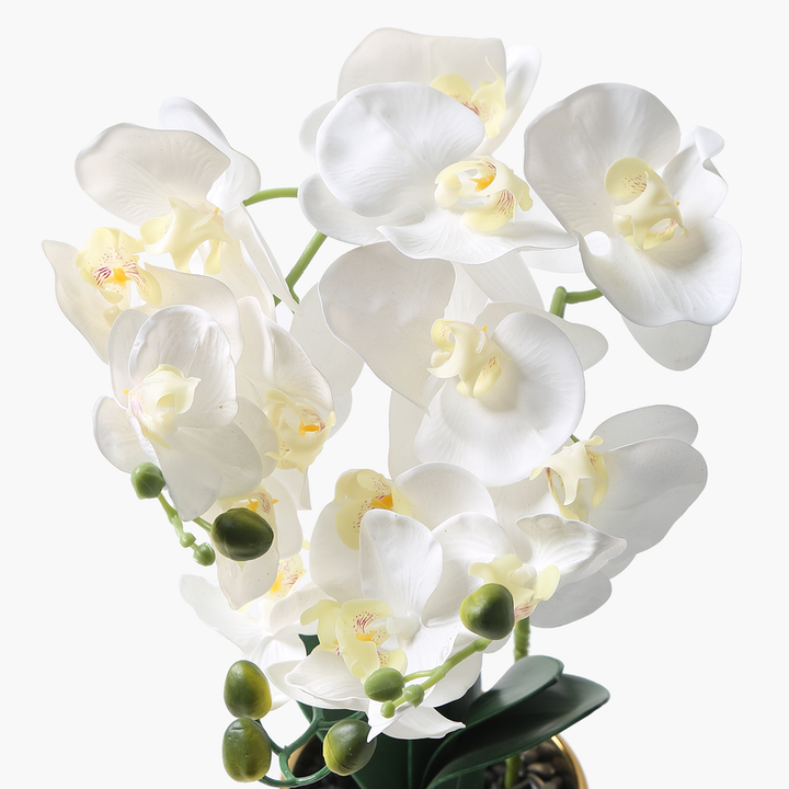 Beyaz saksılı orkide, zarif detaylarıyla dekorasyonunuza eşsiz bir şıklık katıyor. Doğanın zarafetini yansıtan yapay orkide çiçekleri, altın detaylara sahip modern saksısı ile birleşerek her mekâna sofistike bir hava kazandırır. Oturma odası, yatak odası veya ofis gibi alanlarda huzurlu bir atmosfer yaratır.