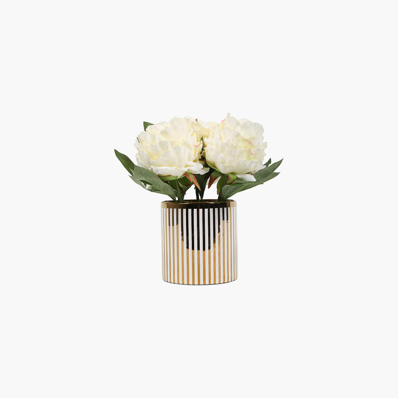Zarif ve göz alıcı beyaz şakayıklarla evinize veya ofisinize taze bir atmosfer katın. Altın detaylı, modern şerit tasarımlı saksısı, bu çiçeği sofistike bir dekorasyon objesi haline getiriyor. Doğal görünümlü yaprakları ve dolgun çiçekleriyle şakayık, şıklık arayanlar için ideal bir tercih.