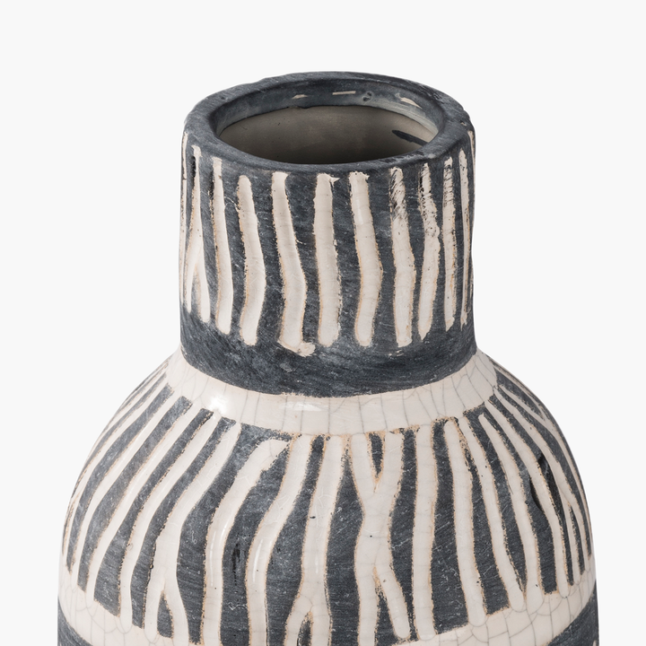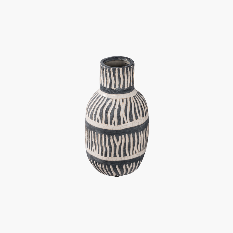 12.5x12.5x22 cm boyutlarındaki bu seramik ethnic vazo, el yapımı detayları ve benzersiz desenleriyle yaşam alanlarınıza sanatsal bir dokunuş katar. Siyah ve beyaz tonların uyumuyla oluşturulan geometrik desenler, modern ve etnik dekorasyon stillerine mükemmel bir şekilde uyum sağlar. Mat seramik yüzeyi ve çatlak dokusu, bu vazoyu hem estetik hem de özel kılar. Evinizin salonunda, yatak odasında veya otel ve restoran dekorasyonlarında dikkat çekici bir merkez parça olarak kullanabilirsiniz.