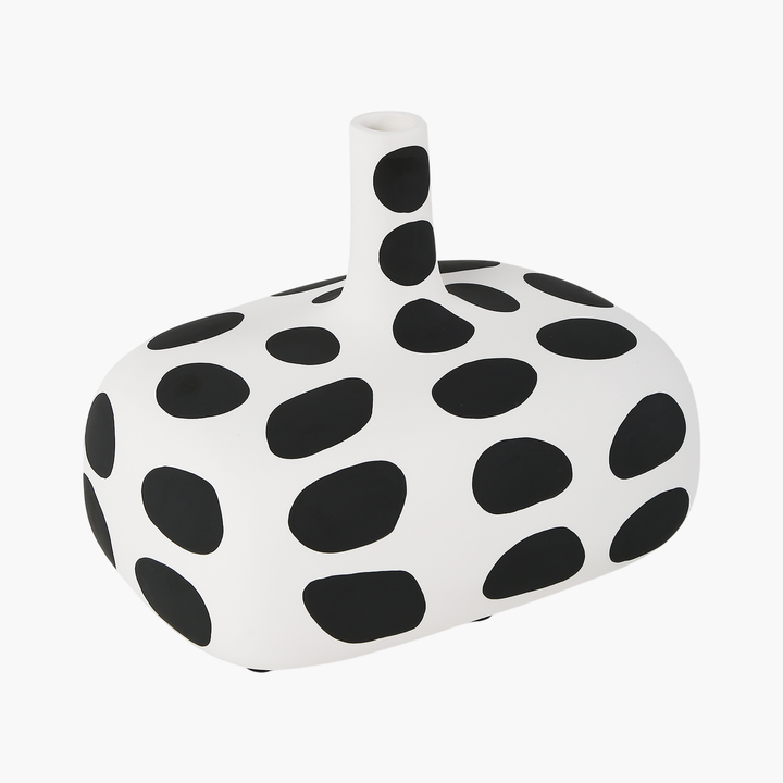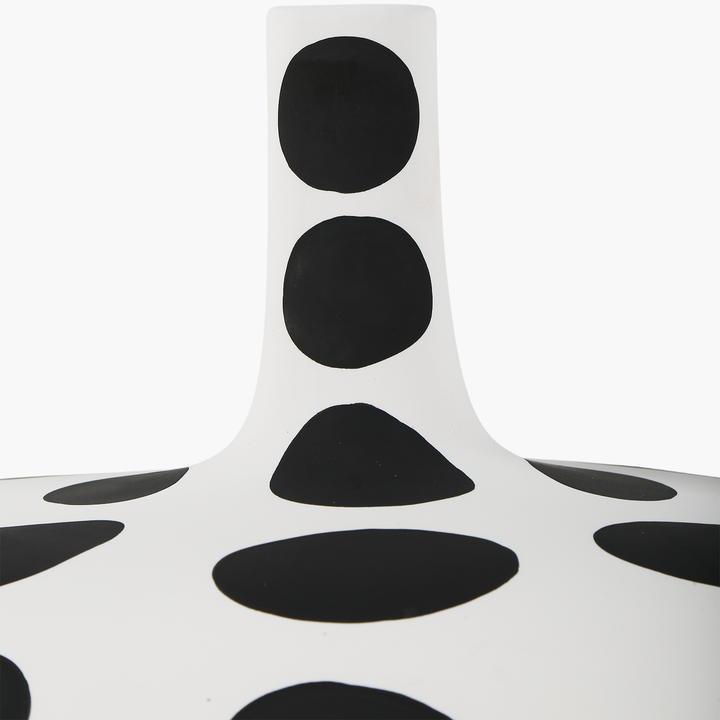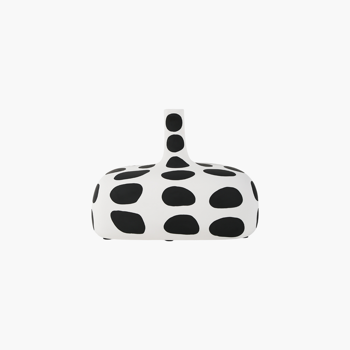Ürün Metni: Bu modern seramik vazo, dikkat çekici siyah-beyaz desenleriyle her mekanda fark yaratır. 35.5X26.5X26.5 cm boyutlarıyla ideal bir yer kaplar ve modern tasarımı ile zarif bir görünüm sunar. Siyah büyük noktalar, beyaz zeminle mükemmel bir kontrast oluşturur ve vazonun her açıdan göz alıcı bir etki yaratmasını sağlar. Hem ofis hem de ev dekorasyonunda şıklığı ve sadeliği birleştirir.