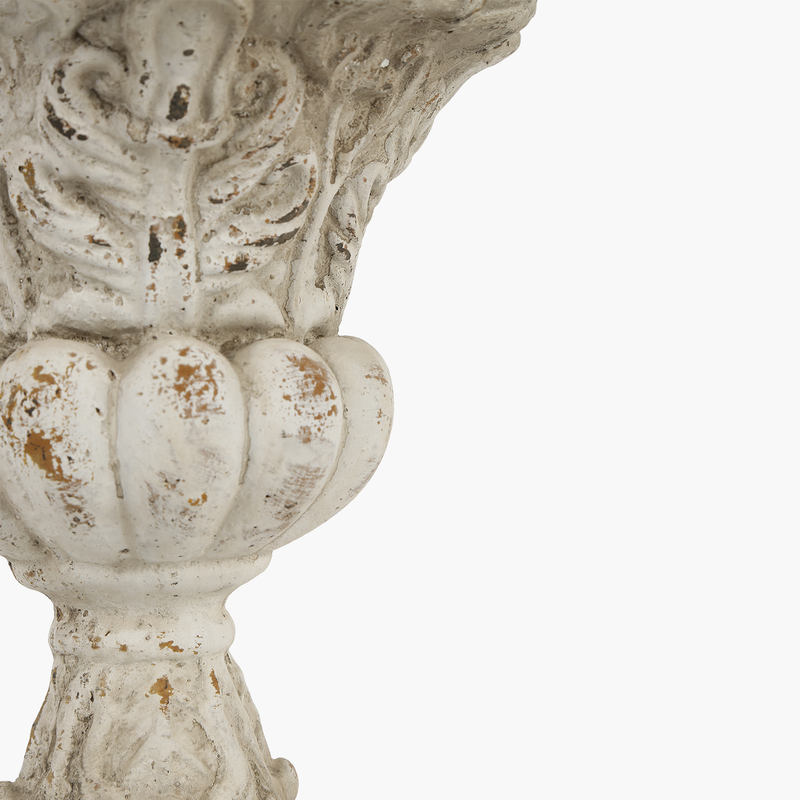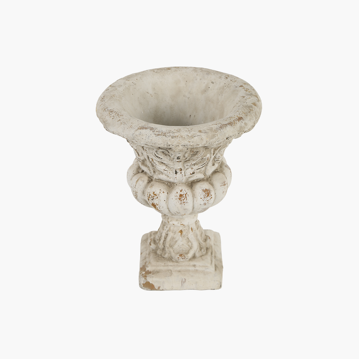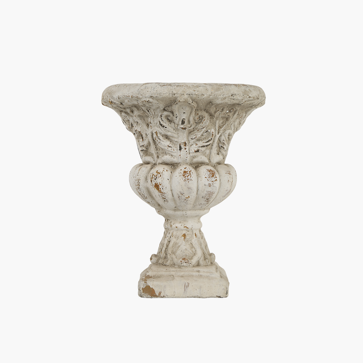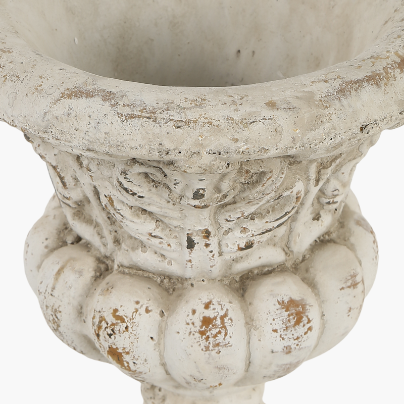 Antik dönemin zarafetini modern dekorasyonla birleştiren bu standlı saksı, mekanlarınıza sofistike bir hava katıyor. Eskitilmiş beyaz yüzeyi ve kabartmalı detaylarıyla hem nostaljik hem de şık bir tasarım sunuyor. Salon, bahçe veya otel lobilerinde dikkat çeken bir atmosfer yaratır.