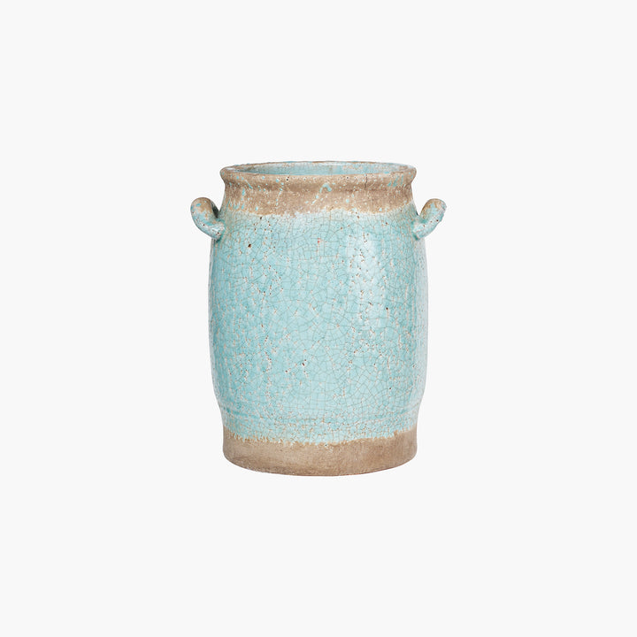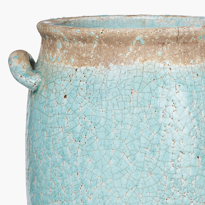 26x22x30 cm boyutlarındaki bu büyüleyici terracotta vazo, el yapımı dokusu ve doğal renk geçişleriyle iç mekanlarınıza sofistike bir hava katıyor. Yeşil-mavi tonları ve çatlak yüzey deseni, vintage ve rustik tarzı kusursuz bir şekilde birleştiriyor. Kulpları sayesinde geleneksel formları çağrıştıran bu vazo, ev, otel veya restoran dekorasyonunuzda fark yaratacak bir parça. Hem estetik hem de işlevsel bir obje olarak, kuru bitkilerle veya minimalist aranjmanlarla uyum sağlar.