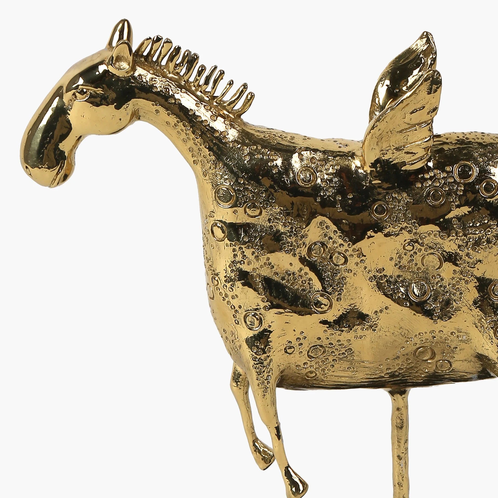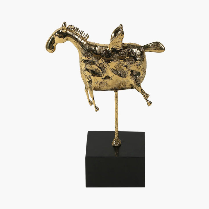 "Uçan At" heykeli, modern tasarımıyla hayal gücünü ve zarafeti bir araya getiren eşsiz bir sanat eseridir. Bakırdan üretilmiş ve altın rengi ile tamamlanmış bu obje, dekorasyonunuza neşe ve zarif bir dokunuş katar. Siyah kaidesi, heykelin dengesini sağlarken onu daha da ön plana çıkarır.