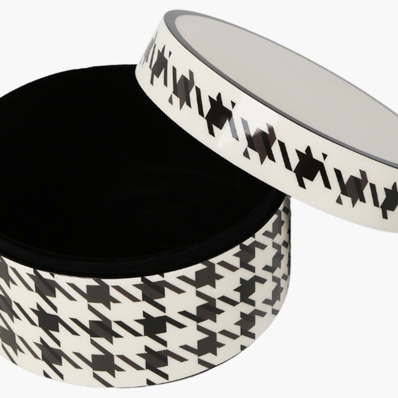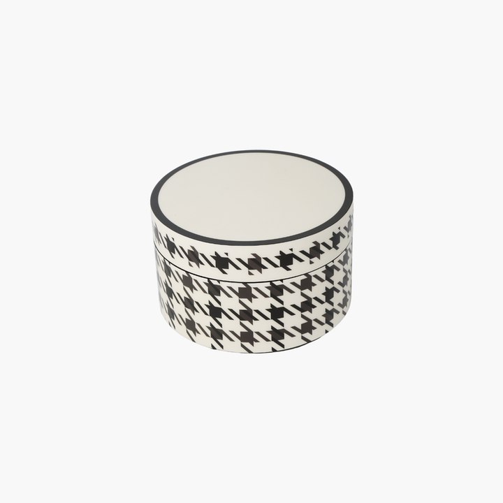 Ürün Metni: Bu şık yuvarlak kutu, modern iç mekanlara zarif bir dokunuş katıyor. Houndstooth deseni ile bezenmiş yüzeyi, sofistike ve şık bir hava yaratırken, klasik siyah ve beyaz kontrastı her alana uyum sağlar. Kutu, hem dekoratif hem de fonksiyonel bir parça olup, küçük eşyalarınızı düzenli tutmanın yanı sıra yaşam alanlarınıza estetik bir katkı sağlar. Üst kısmındaki pürüzsüz yüzey ise minimal bir görünüm sunar.